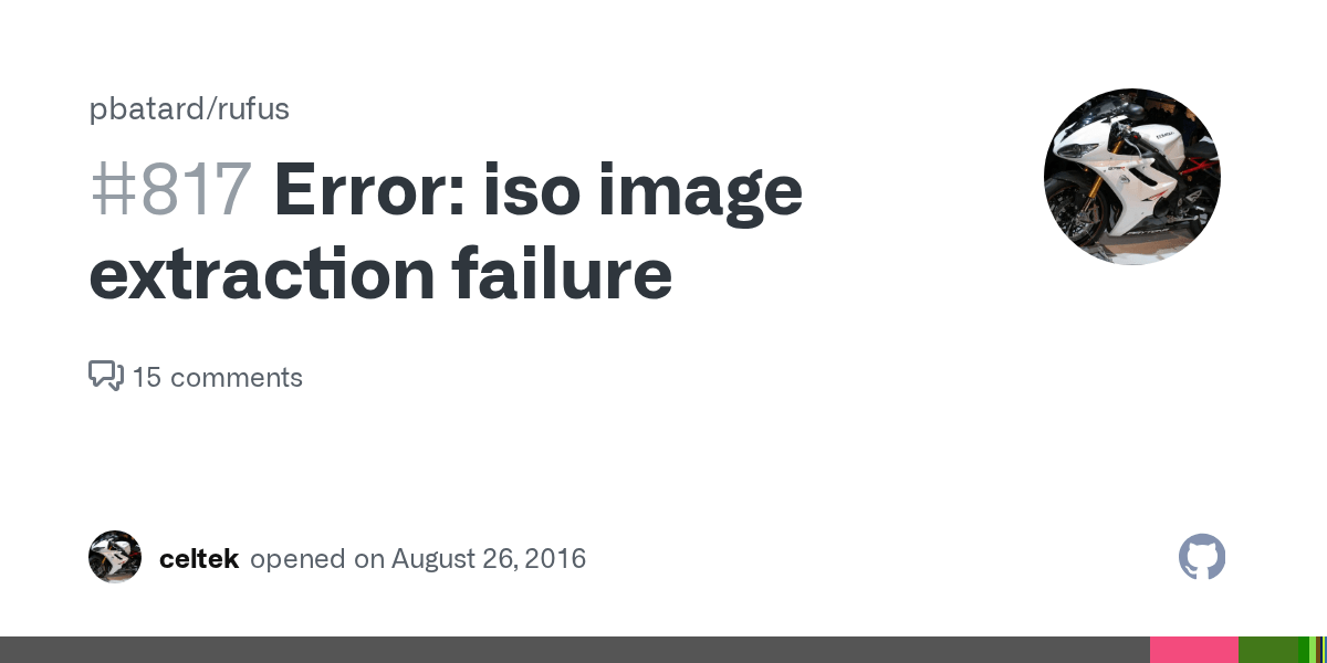 How to solve error iso image extraction failure. I'm using rufus to create a bootable stick, but everytime i click start, it starts, and then gives the error iso image extraction failure. Rufus is a small program for converting a normal flash drive into a complete bootable usb . Device is already in use by another process or 2. I'm using rufus to create a bootable stick, but everytime i click start, it starts, and then gives the error iso image extraction failure.
